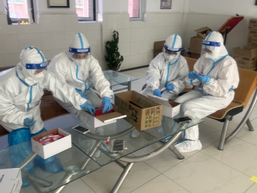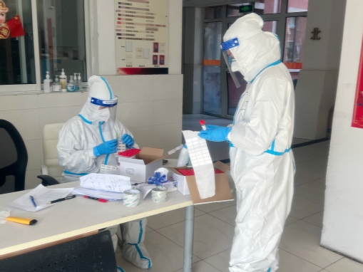 (“‘疫’路守护”第八宿舍临时党支部书记、专职辅导员高加加老师、驻楼志愿教师李彬老师做核酸检测准备)