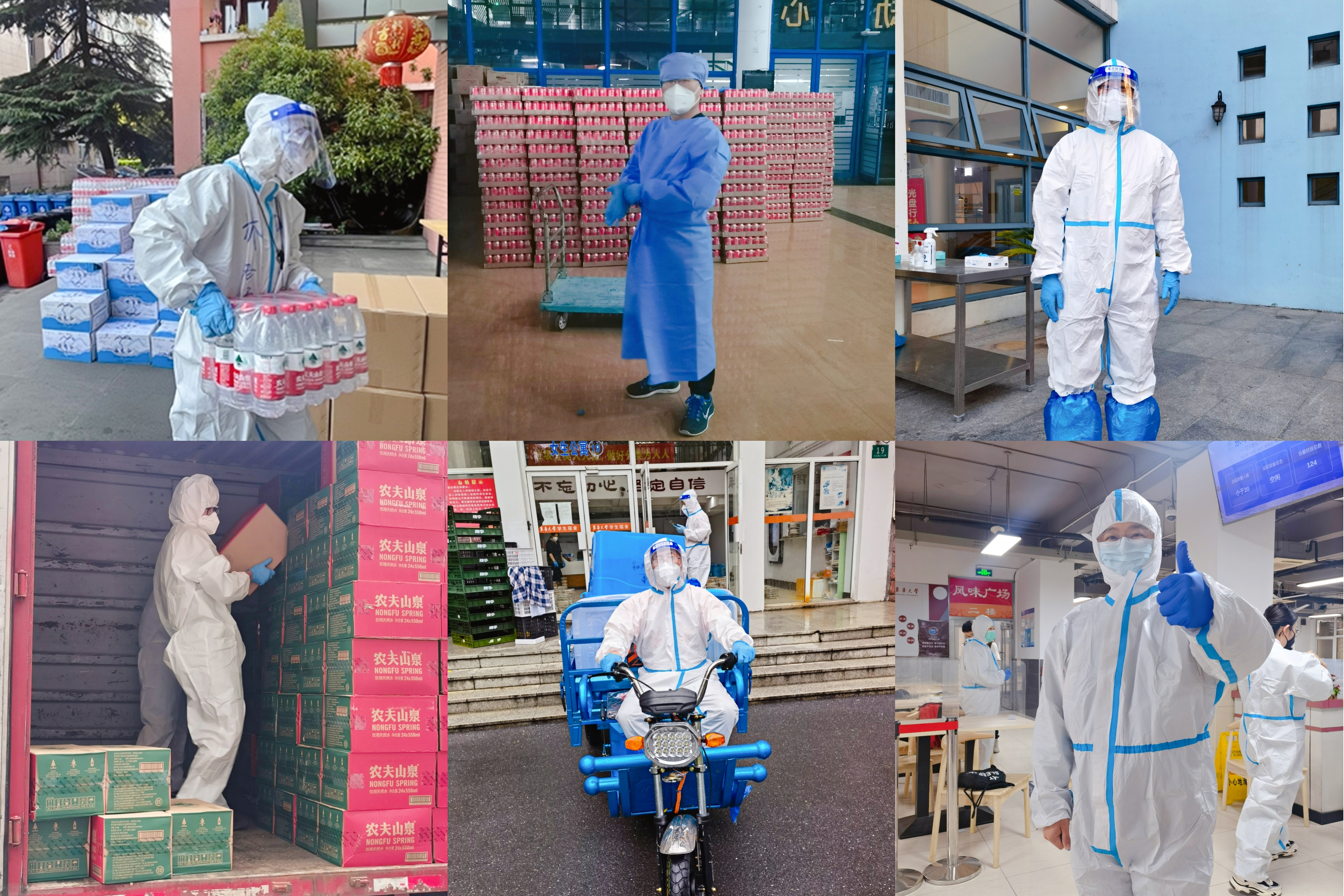 (学校党派团体成员奔忙于学生宿舍驻楼、送餐、物资搬运和核酸检测等志愿服务工作队伍中)